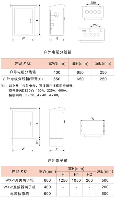 戶外不銹鋼端子箱適用于交流、直流電路中,采用標準鋼板不銹鋼臺架,加裝端子組成成套裝置后,作為變壓器、斷路器、互感器等電力設(shè)備的接線端子箱使用。 不銹鋼電纜分線可分為戶內(nèi)、戶外兩種,戶內(nèi)型適用于各種建筑物中的低壓電纜分接支線,戶外型適用于城市住宅小區(qū)、工業(yè)區(qū)等,供戶外220/380V電纜樹干式網(wǎng)絡(luò)分支接線用。箱內(nèi)采用銅排安裝,并附有斷路器作控制及保護之用。 |
